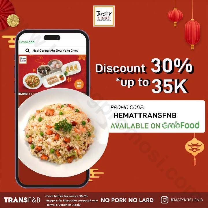 Dapetin diskon 30% up to 35k min. pembelian 80.000 Pilih menu favoritmu di all outlet Tasty Kitchen, dan masukkan promo code: HEMATTRANSFNB via Grabfood