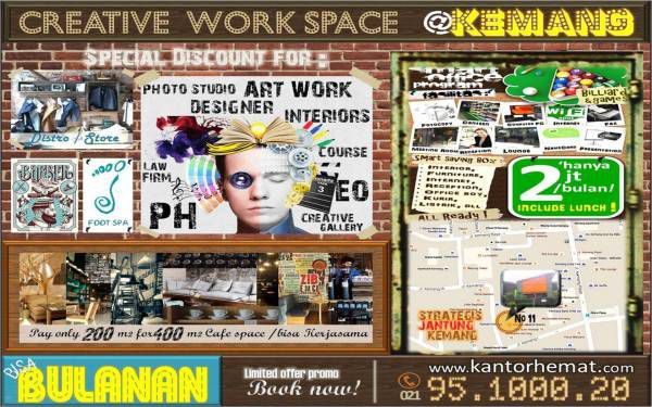 Kami memiliki banyak pilihan untuk gaya kerja apapun, andapun dapat memesan gaya ruang kerja sesuai selera anda. harga sewa mulai 2jutaan perbulan. Lokasi strategis di kawasan elit kemang.