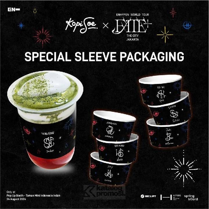 Ini dia yang ditunggu-tunggu! MinSoe mau kasih kabar bahagia buat Engene! Sleeve cup dari kolaborasi Kopi Soe x ENHYPEN WORLD TOUR FATE PLUS THE CITY JAKARTA ada versi baru Inisial Member ENHYPEN lho!