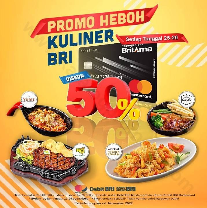 HAPPY DAY Promo HEBOH KULINER BRI – Diskon 50% dengan Kartu Debit & Kredit BRI Mastercard.