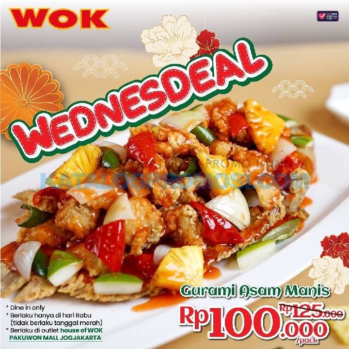 [WEDNESDEAL AT WOK] Best deal untuk kalian para pecinta WOK karena setiap hari rabu dapatkan spesial promo Gurami Asam Manis Rp.100.000! Promo hanya berlaku di house of WOK Pakuwon Mall Jogja✅ Tidak dapat di gabung dengan promo lain✅ Tidak berlaku di tanggal merah✅ Dine-in only✅