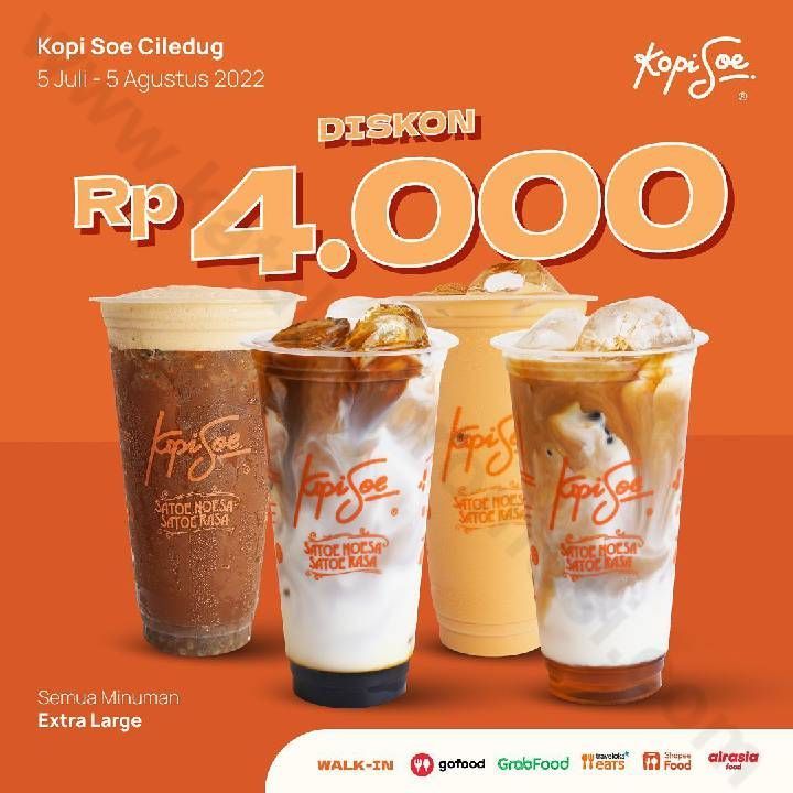 Potongan 4K untuk semua menu uk. Extra Large (Kopi Soe Goela Merah, Kopi Rum, Kopi Hitam, Es Terik, Es Thai Tea)
