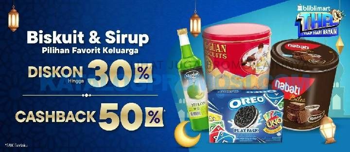 Promo biskuit dan sirup di Blibli hadir untuk menghangatkan suasana ramadhan dan memeriahkan lebaran dengan diskon hingga 30% dan cashback sampai 50%. Ada banyak pilihan biskuit populer dan sirup dengan sensasi menyegarkan serta bervariasi rasanya.