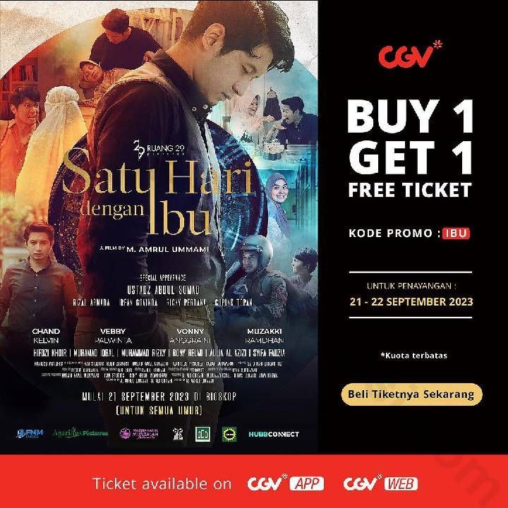Traktir Ibu kamu nonton <Satu Hari Dengan Ibu> di CGV karena ada promo Beli 1 Gratis 1 tiket setiap pembelian di web, aplikasi, atau loket CGV.