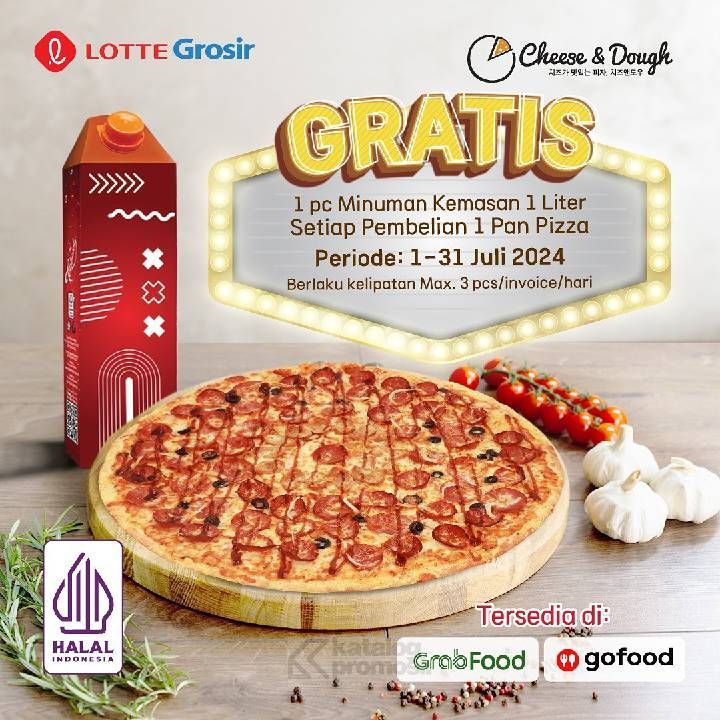 Promo CHEESE & DOUGHGRATIS Minuman setiap pembelian 1 pan pizza untuk pemesanan melalui order online di Grab Food atau Go Food BERLAKU selama bulan JULI 2024