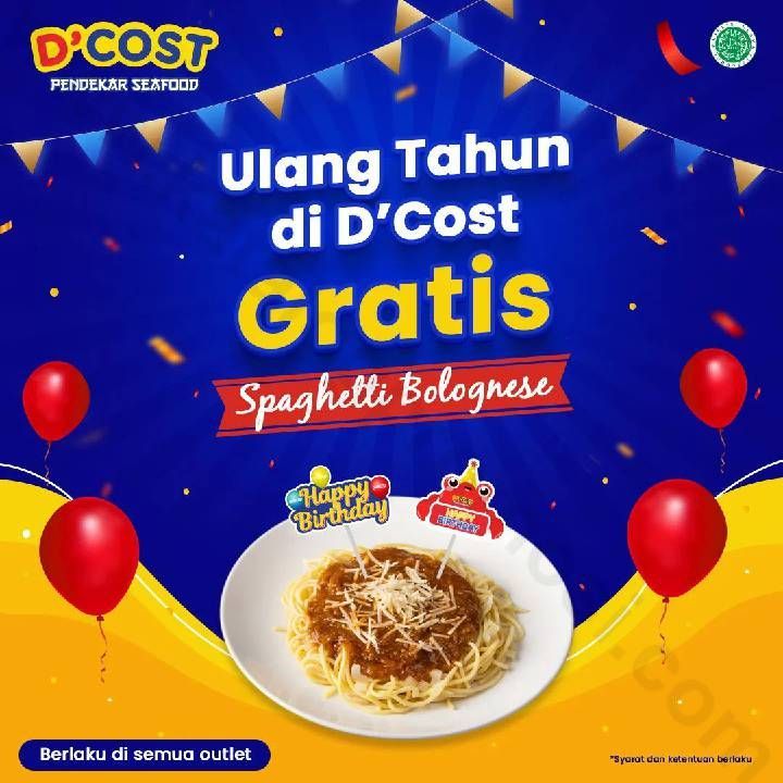 Seafood Lovers, kamu bisa loh ditraktir 1 porsi Spaghetti Bolognese saat berulang tahun di D’Cost. Caranya mudah banget, tinggal mampir ke D’Cost terdekat dan sampaikan pada staff D’Cost bahwa kamu berulang tahun