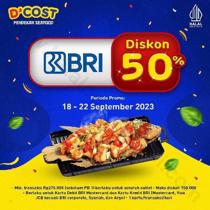 Promo D’COST DISKON 50% dengan Kartu Debit BRI Mastercard dan Kartu Kredit BRI.