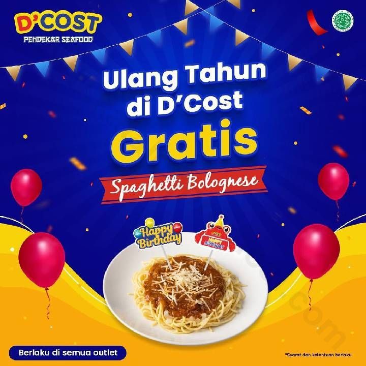Seafood Lovers, kamu bisa loh ditraktir 1 porsi Spaghetti Bolognese saat berulang tahun di D’Cost. Caranya mudah banget, tinggal mampir ke D’Cost terdekat dan sampaikan pada staff D’Cost bahwa kamu berulang tahun