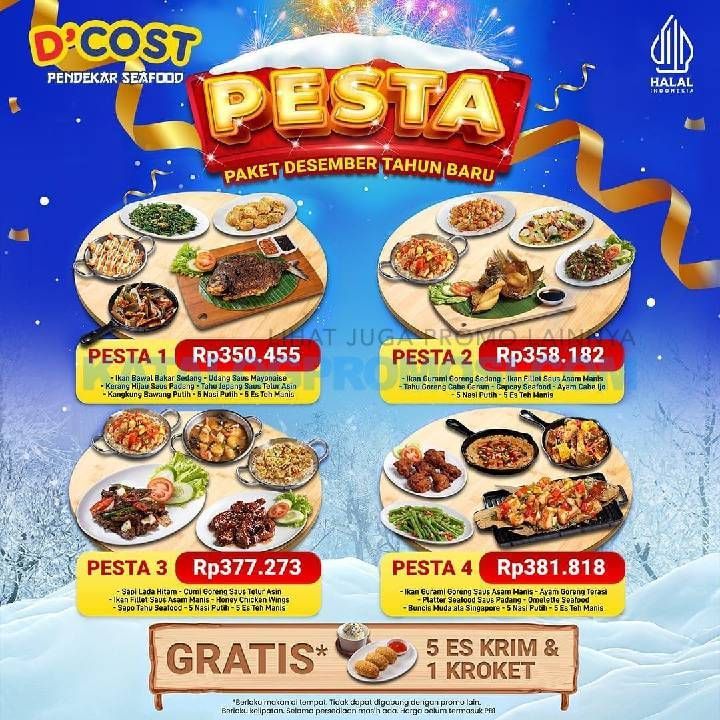 MARI SEAFOOD LOVERS KITA BER-PESTA DI D’COST Promo yang Seafood Lovers tunggu-tunggu nih✨ Mari rayakan keceriaan akhir tahun di D’Cost dengan paket PESTA (Paket Desember Tahun Baru). Cocok banget dinikmati ramai-ramai bareng bestie dan keluarga untuk menyambut akhir tahun yang ceria di D’Cost