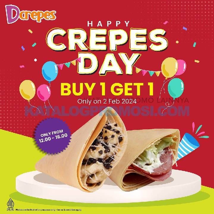 Syarat & ketentuan: – Hanya berlaku untuk pembelian di outlet pada tanggal 2 Februari 2024 – Hanya berlaku dari jam 12.00 – 16.00 – Hanya berlaku untuk 50 customer pertama – Wajib membeli 1 Crepes apa saja dan Gratis 1 Choco Cheese – Berlaku di seluruh outlet Dcrepes – Free produk tidak dapat diganti dengan produk lainnya – Setiap customer hanya bisa mendapatkan 1 promo saja (tidak berlaku kelipatan) – Setiap customer wajib menunjukkan bukti follow IG @d_crepes dan like postingan Crepes Day kepada crew – Tidak dapat digabungkan dengan promo lainnya