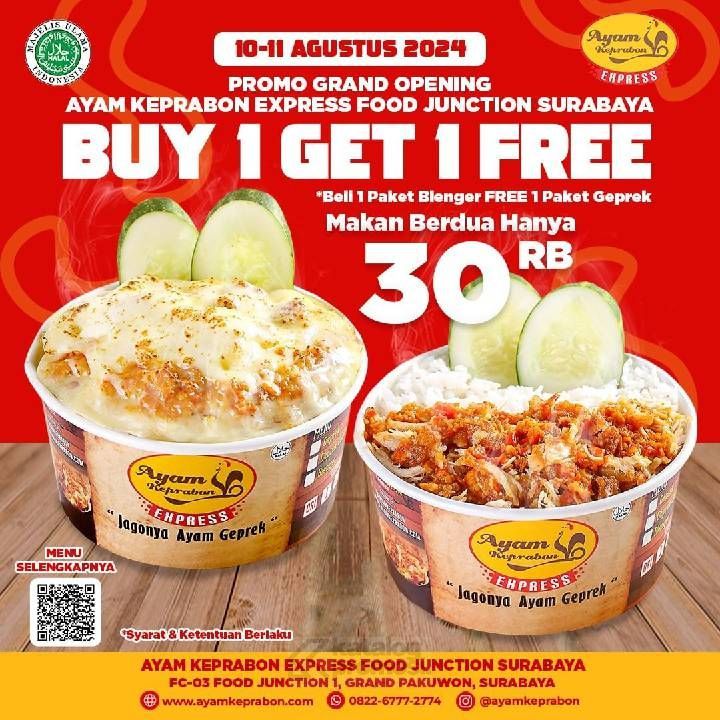 ⚠️Syarat & Ketentuan : ⚠️ 1. Pembelian 1 porsi Paket Blenger FREE 1 porsi Paket Geprek 2. Hanya berlaku di Ayam Keprabon Express Food Junction Surabaya 3. Promo berlaku pada tgl 10 – 11 Agustus 2024 4. Promo berlaku pembelian dine in, take away dan via online GoFood, Grabfood & ShopeeFood 5. Promo berlaku 1 orang atau driver ojol max. free 2 pack 6. Tidak berlaku kelipatan 7. Selama persediaan masih ada 8. Harus mematuhi protokol kesehatan dengan ketat