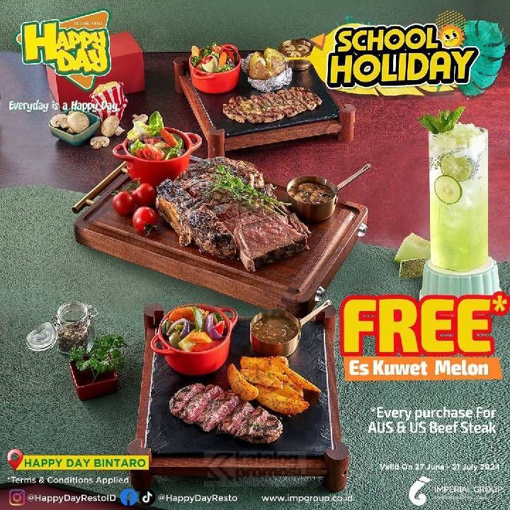 Liburan sekolah jadi lebih berwarna dengan Promo School Holiday dari Happy Day ! Dapatkan Gratis menu Es Kuwet Melon setiap pembelian menu AUS & US Beef Steak di Happy Day, Bintaro.