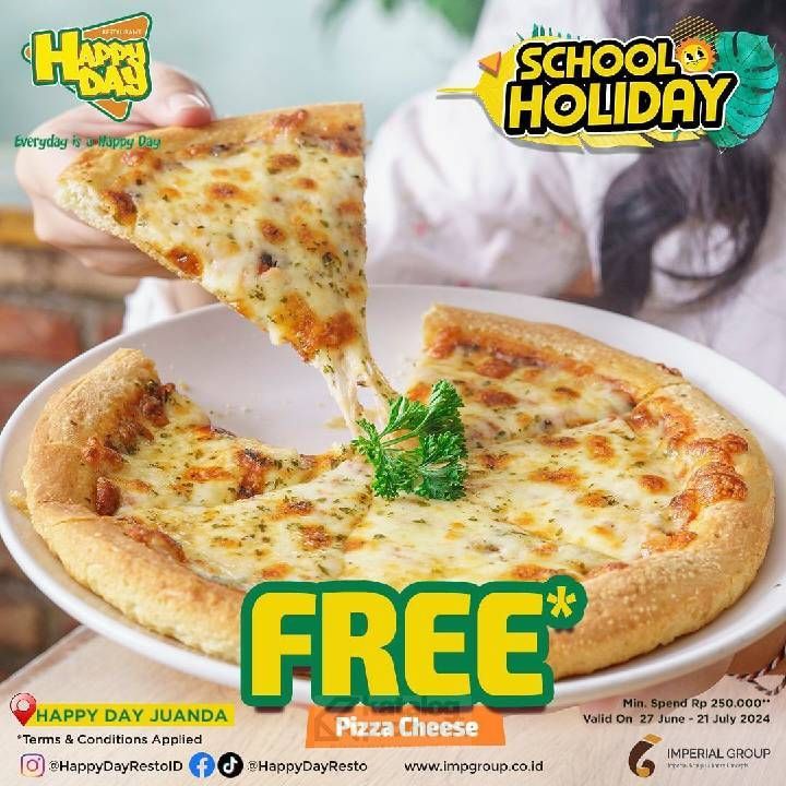 Liburan sekolah jadi lebih berwarna dengan Promo School Holiday dari Happy Day ! Dapatkan Gratis menu Pizza Cheese setiap pembelian dengan min spend Rp 250,000++ di Happy Day, Juanda.