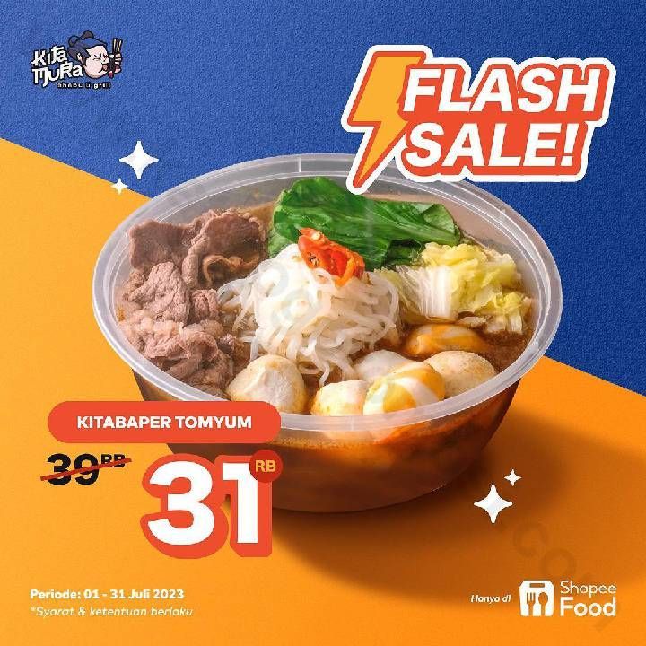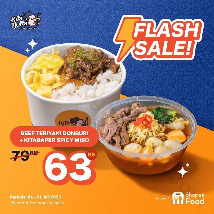 Promo Flash Sale di Shopee untuk 3 menu enak di Kitamura 1. Beef Teriyaki Donburi + Kitabaper Spicy Miso, kalian bisa dapetin 2 menu ini dengan harga cuma 63K aja lohhh 2. Kitabaper Tomyum cuma 31K