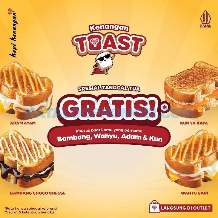 Makan Kenangan Toast GRATIS khusus buat kamu yang bernama Bambang, Wahyu, Adam, dan Kun‼️