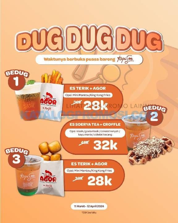 Dug dug dug! Sudah waktunya berbuka puasa bareng Kopi Soe, nih! Nikmati promo Paket Bedugmulai dari 28 RIBU SAJA! Kamu udah bisa dapetin 1 minuman segar Es Terik dan Soerya Tea & 1 snack AGOR atau Croffle!