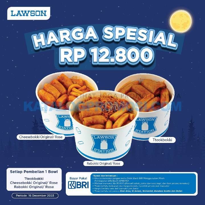Hanya berlaku untuk pembayaran dengan kartu debit BRI (s&k berlaku) Berlaku hanya 16 Desember 2023 Berlaku di Lawson & Lawson shop Alfamidi (kecuali Lawson Bandara (2E & 2D), Ancol Area, Stasiun (Senen & Gambir) & Rest Area