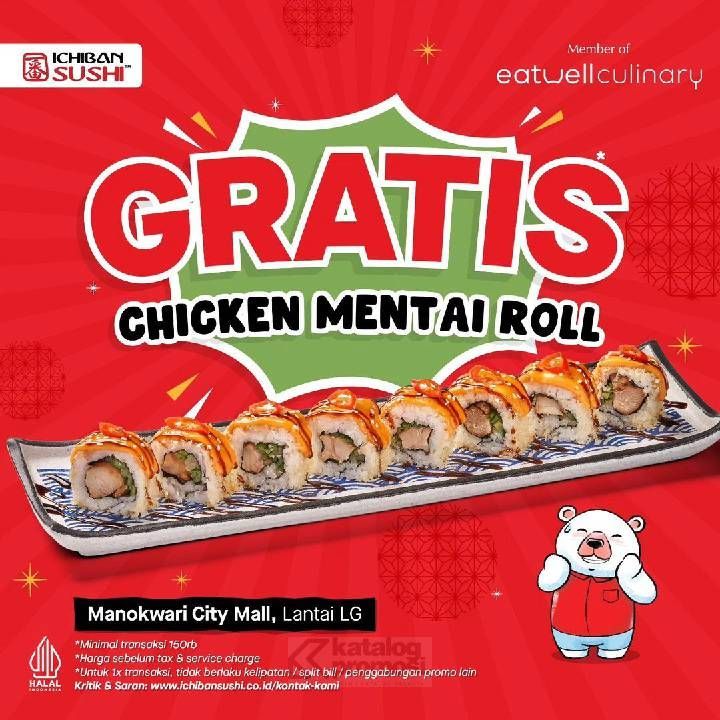 Yuk, langsung aja mampir ke Manokwari City Mall untuk ikut hepi-hepi bareng Ichiban Sushi dan nikmati promo spesial free Chicken Mentai Roll, Ichikuma Friends! ✨❤