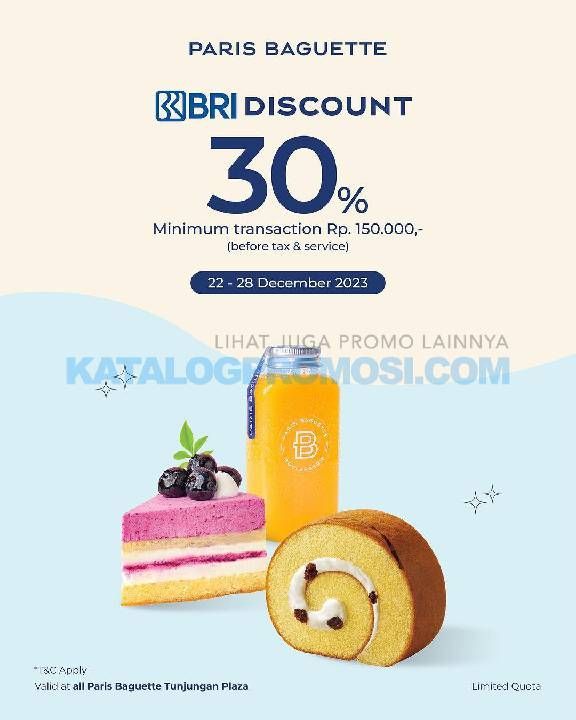 Terms & Conditions : • Discount maximum Rp. 200.000 with minimum transaction Rp. 150.000 (before tax and service) • Valid for dine in and take away • Valid for BRI Debit Cards, Credit Cards, QRIS BRI & BRIMo • No split bill and multiplies • Discount is only valid 1 (one) time/card/day • Cannot be combined with other bank promotions • Can be combined with other Paris Baguette promotions