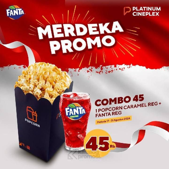 Masih dalam nuansa kemerdekaan di Bulan Agustus! Yuk nonton dan dapatkan PROMO MERDEKA di Platinum Cineplex! Combo 45! Hanya 45 ribu, kamu bisa mendapatkan 1 Popcprn Caramel Reguler + Fanta Ukuran Reguler!