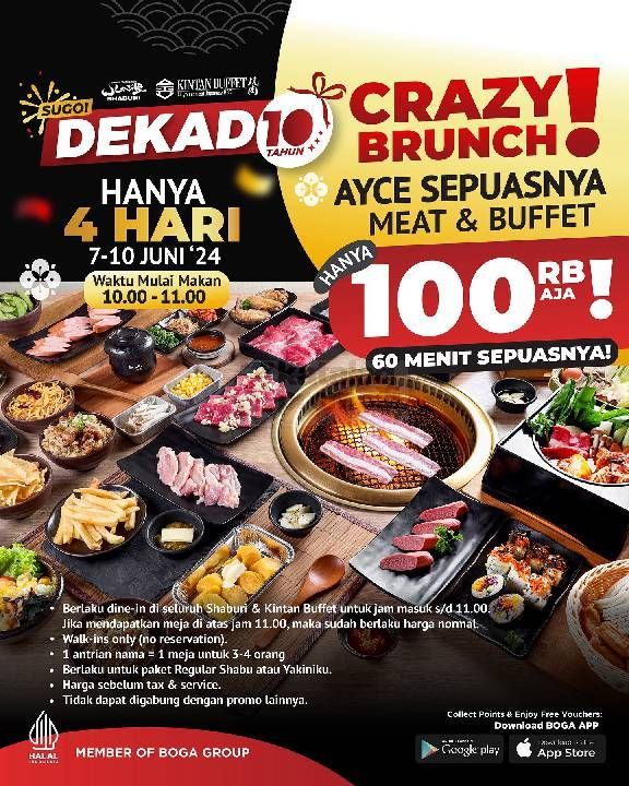 1. Periode Promo : 7-10 Juni 2024 2. Waktu mulai makan : 10.00 – 11.00 WIB 3. Harga Paket AYCE Rp 100.000 per orang untuk 60 menit sepuasnya 4. Berlaku untuk paket Regular Shabu atau Yakiniku 5. Promo berlaku untuk dine-in di semua outlet Shaburi & Kintan Buffet untuk jam masuk sd 11.00, Jika mendapatkan meja di atas jam 11.00 WIB, maka sudah berlaku harga normal. 6. Promo hanya berlaku untuk walk-ins (tanpa reservasi). 7. Satu antrean berlaku untuk 1 meja, maksimal 3-4 orang. 8. Harga belum termasuk pajak dan servis. 9. Promo ini tidak dapat digabungkan dengan promo lainnya.