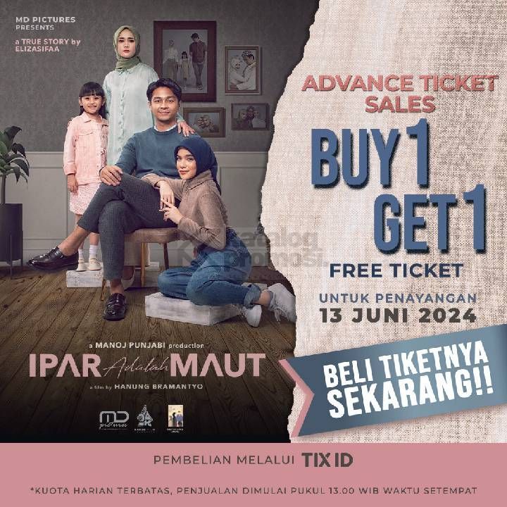 Jangan lewatkan kesempatan untuk dapatkan Buy 1 Get 1 Free Ticket film Ipar adalah Maut yang bisa kamu serbu di aplikasi TIX ID mulai pukul 13.00 WIB!