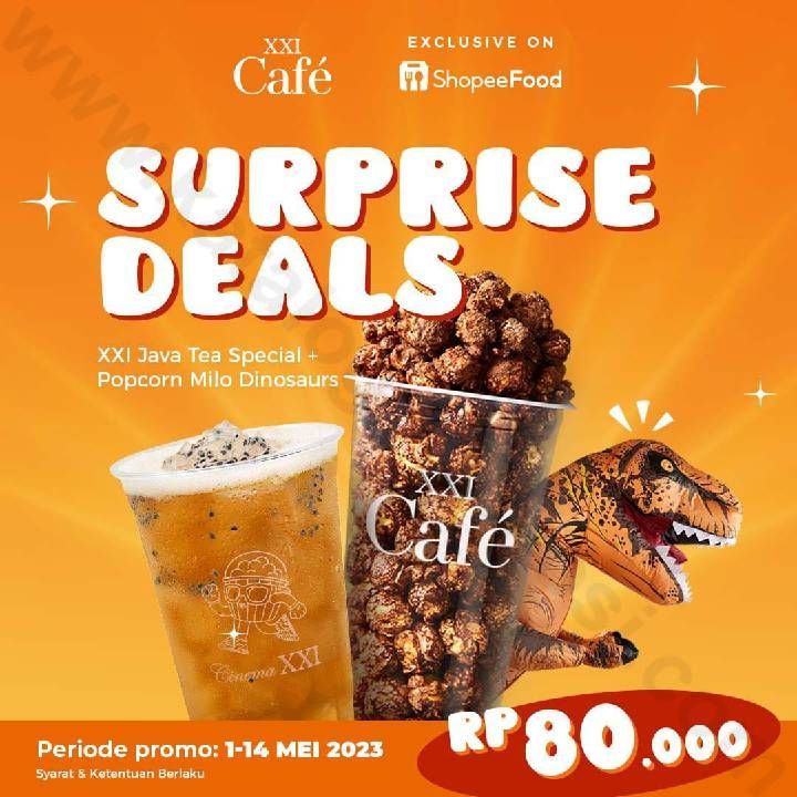Promo XXI CAFE SURPRISE DEALS – Beli Popcorn Milo Dinosaurs + XXI Java Tea Special khusus pemesanan via SHOPEEFOOD.