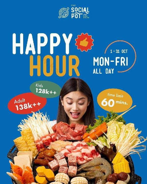 Terms and Condition: – Promo Happy Hour Rp 138.000++ Adult, Rp 128.000++ Child/Senior – Promo berlaku di hari Senin – Jumat, kecuali Outlet The Social Pot Citos (Senin – Minggu) – Waktu makan 60 menit – Berlaku All Day – Promo berlaku di seluruh outlet – Tidak dapat digabungkan dengan promo lainnya – Promo ini berlaku mulai dari 1 Oktober – 31 Oktober 2023